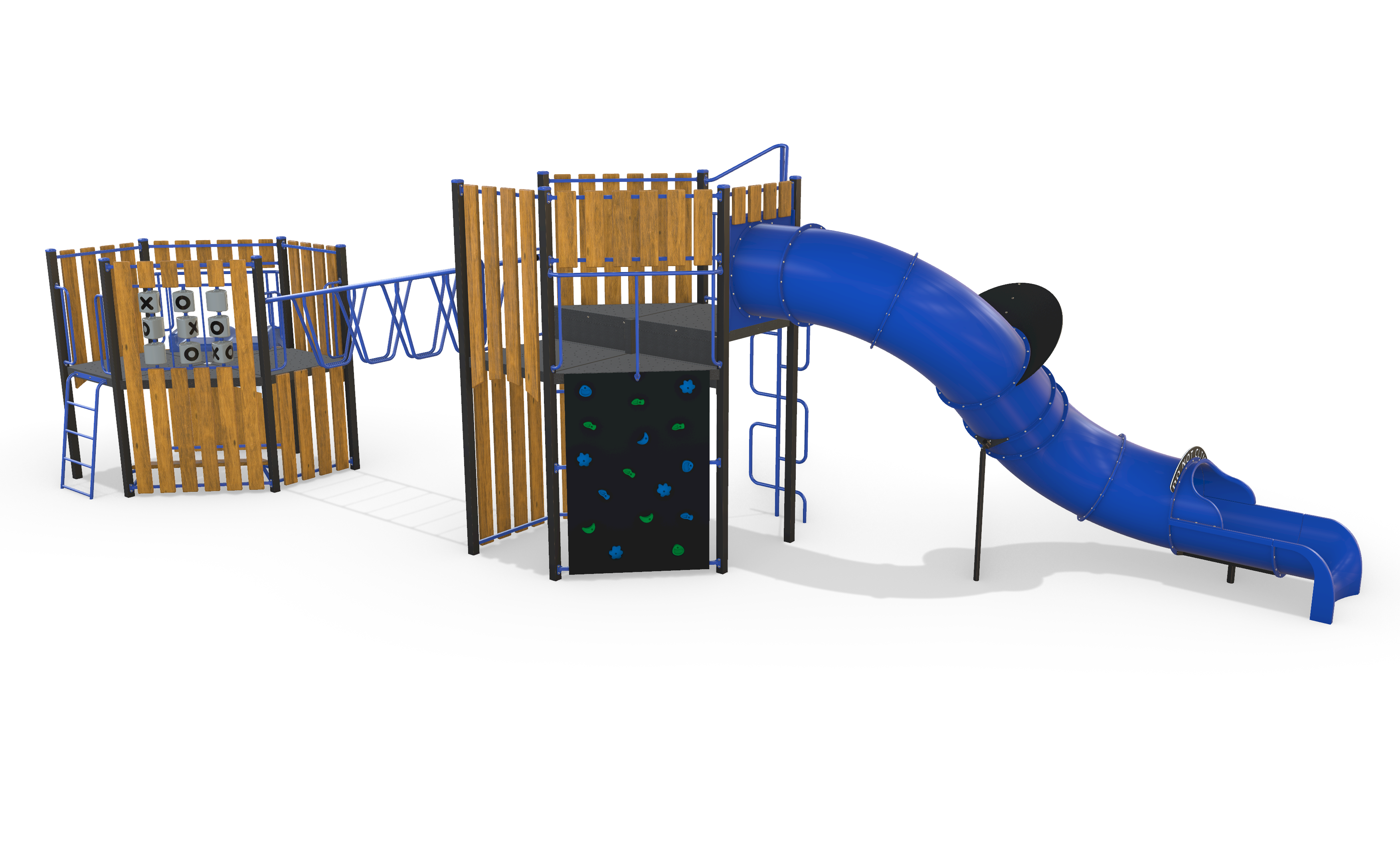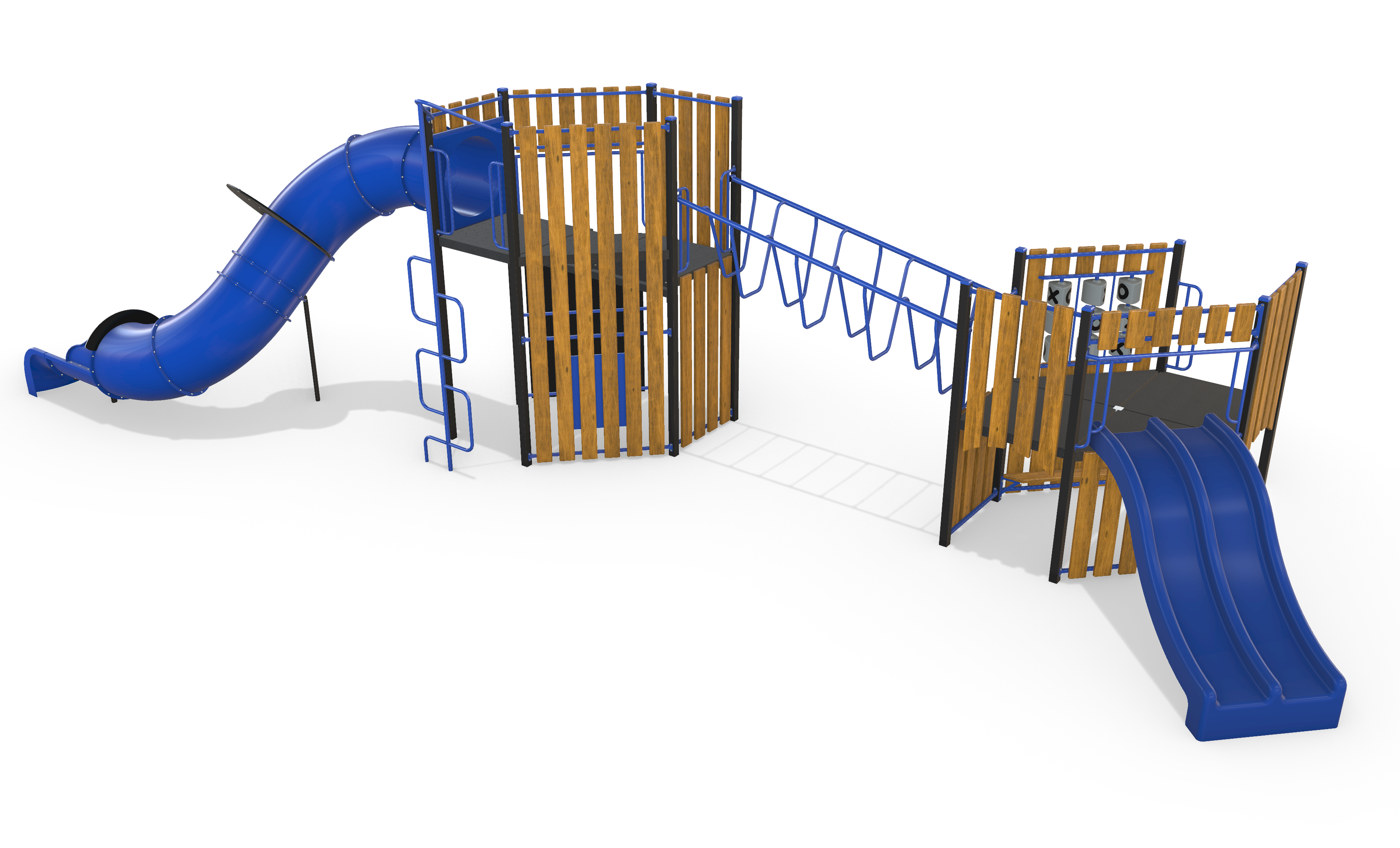 Introducing the Judd Park Combination Unit, featuring uniquely shaped platforms that create a towering lookout for young adventurers. Ascend the heights and descend with exhilaration on the 2100 platform tunnel slide or the exciting double open slide, promising thrills for all ages.