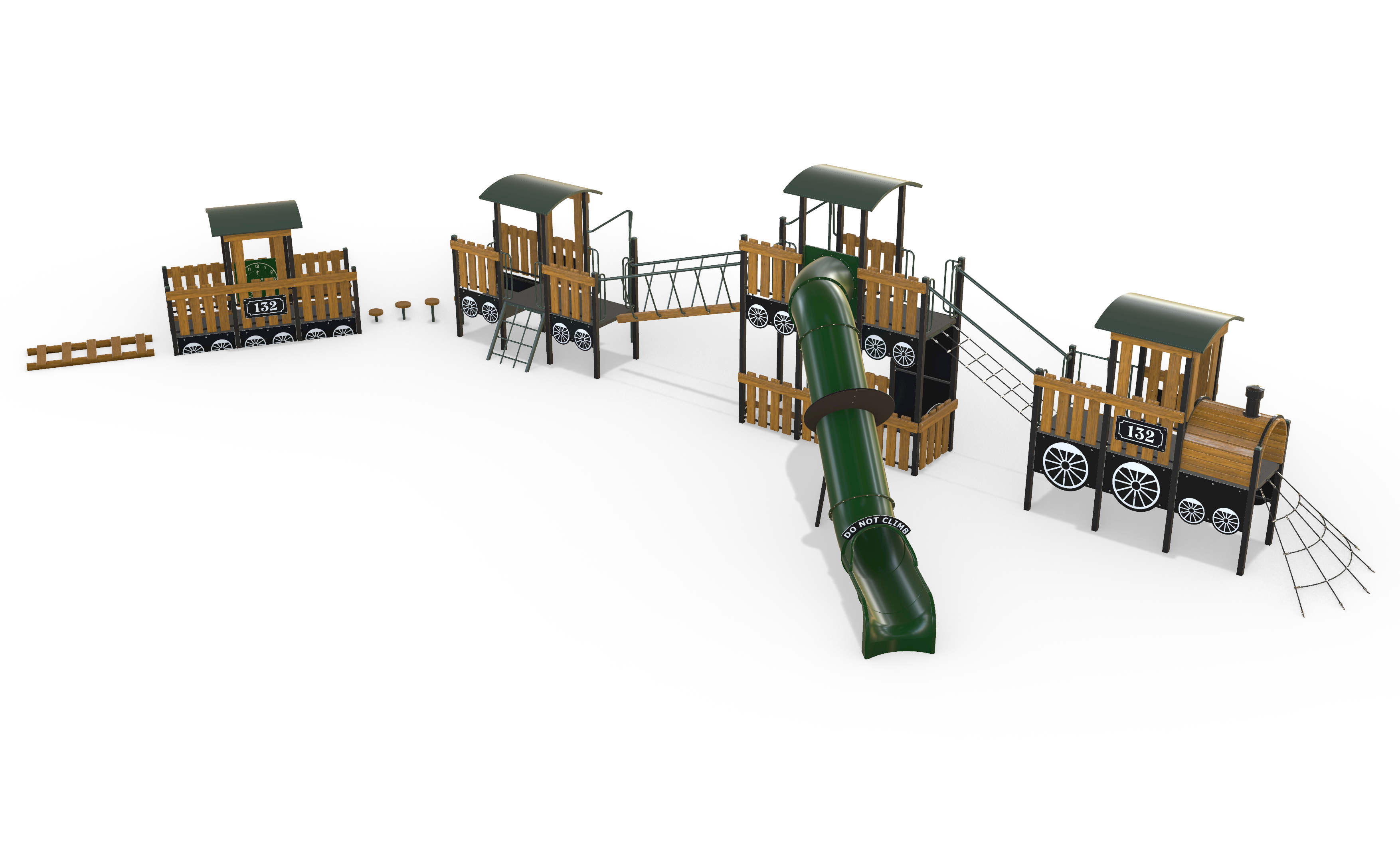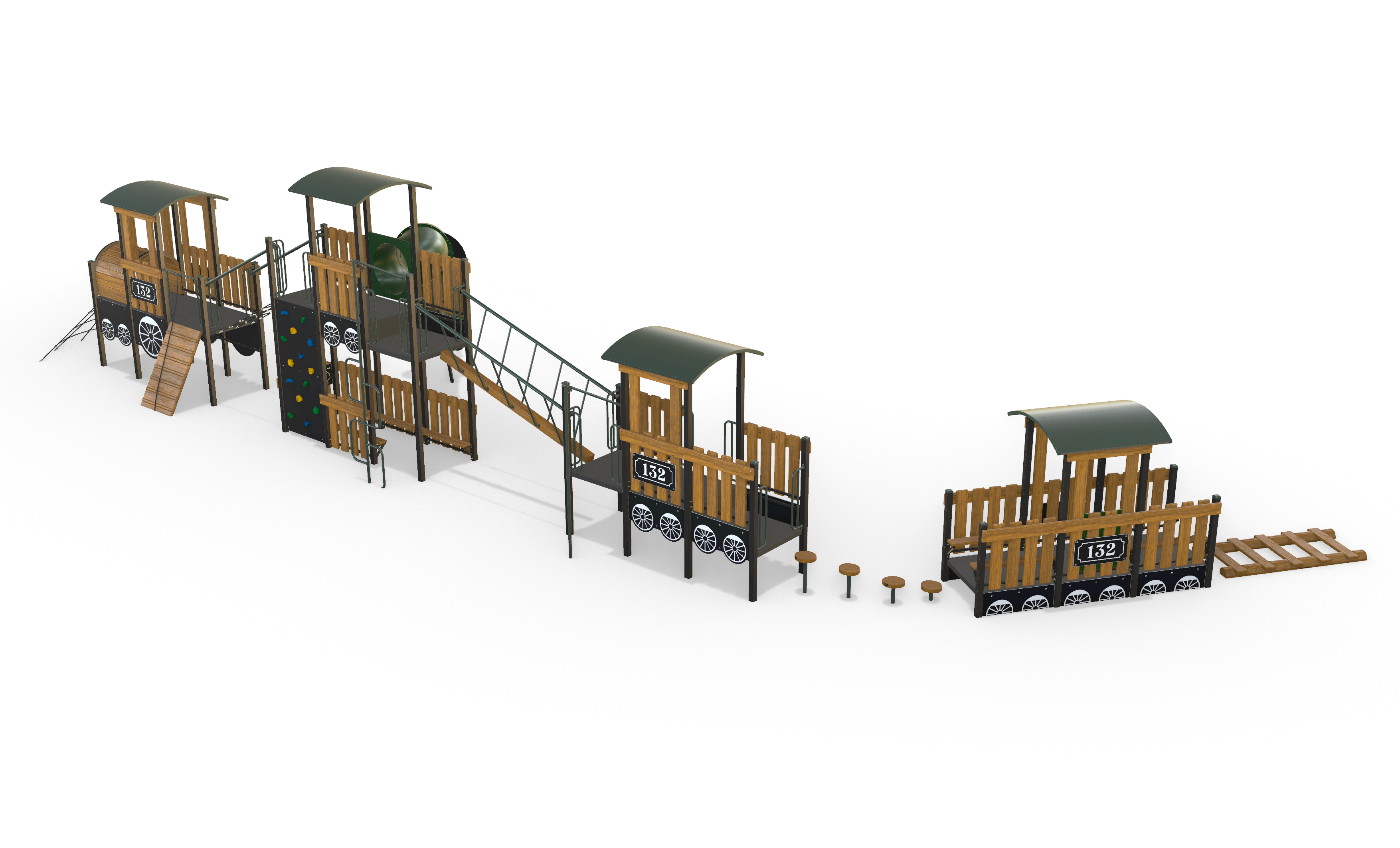 All aboard! Our train-themed playground combination unit is designed to entertain children of all ages with its mix of fun and imaginative play. Features include a train track balance beam, cozy carriage seat, spinning clock activity panel, train cab window panel, and natural timber stepping stones. Kids can climb the honeycomb climber, fire-pole, spider climber, and rock climbing wall, or slide down the tunnel slide. They can explore the timber catwalk, net bridge, and climbing ramp, and enjoy the integrated train engine crawl tunnel and train front climber. The arched roof provides shade, and the undercarriage features a dashboard driving panel and carriage seating. This captivating unit offers endless hours of fun and adventure for parks, schools, and community spaces.