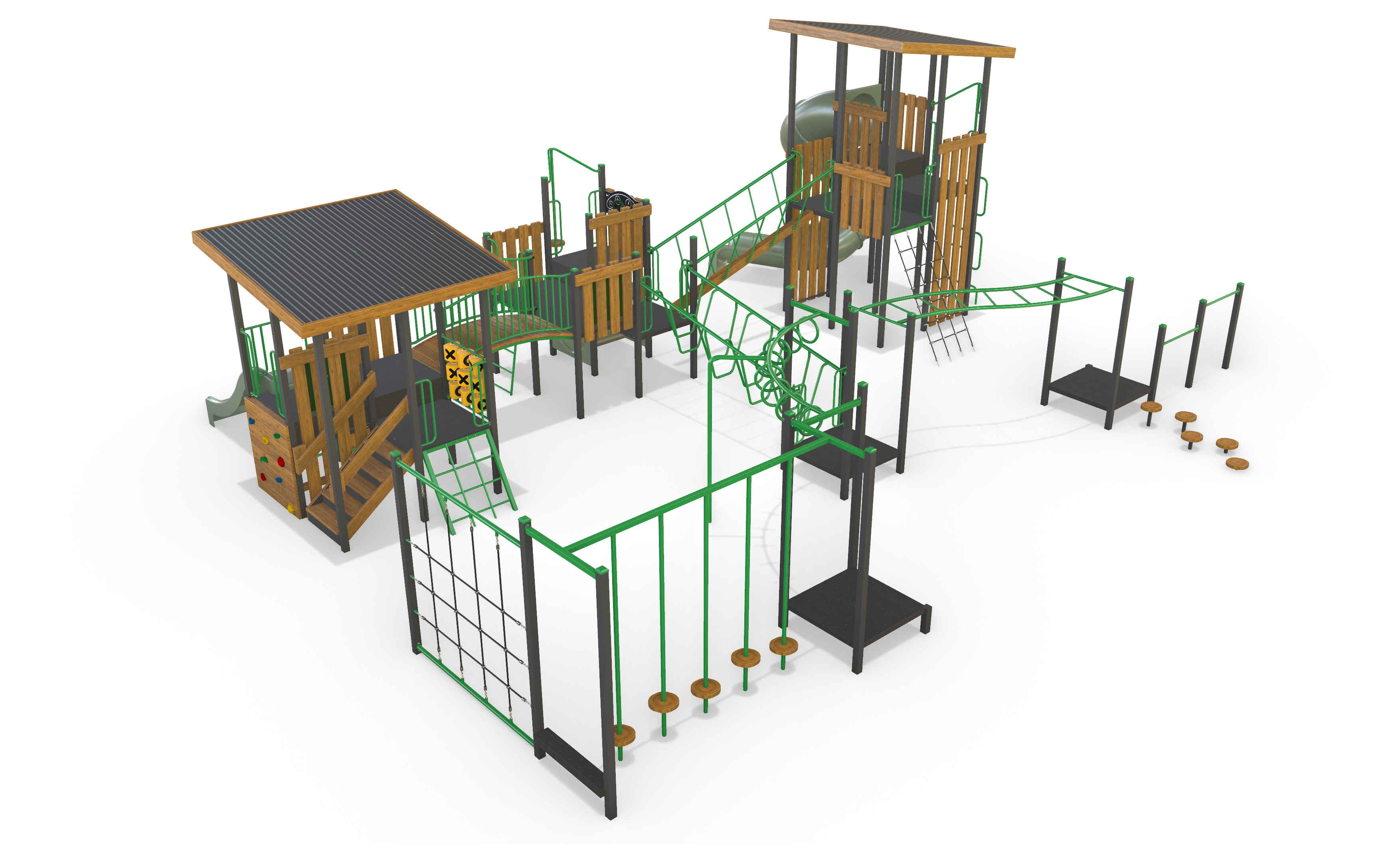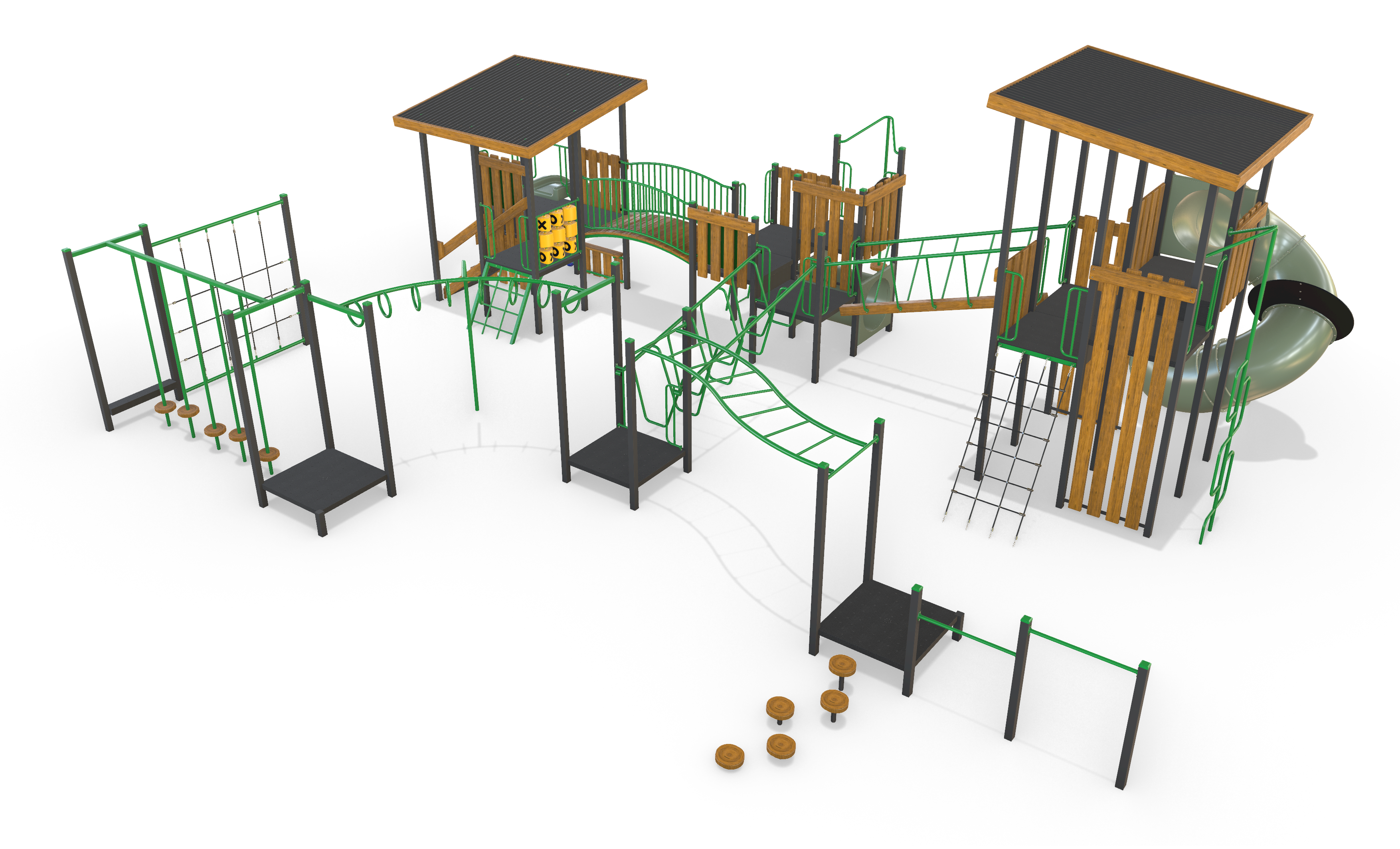 This Playground has it all and can be customised to add additional units or standalone products such as a swings, rockers or a seesaw. Or can be minimised for smaller projects.