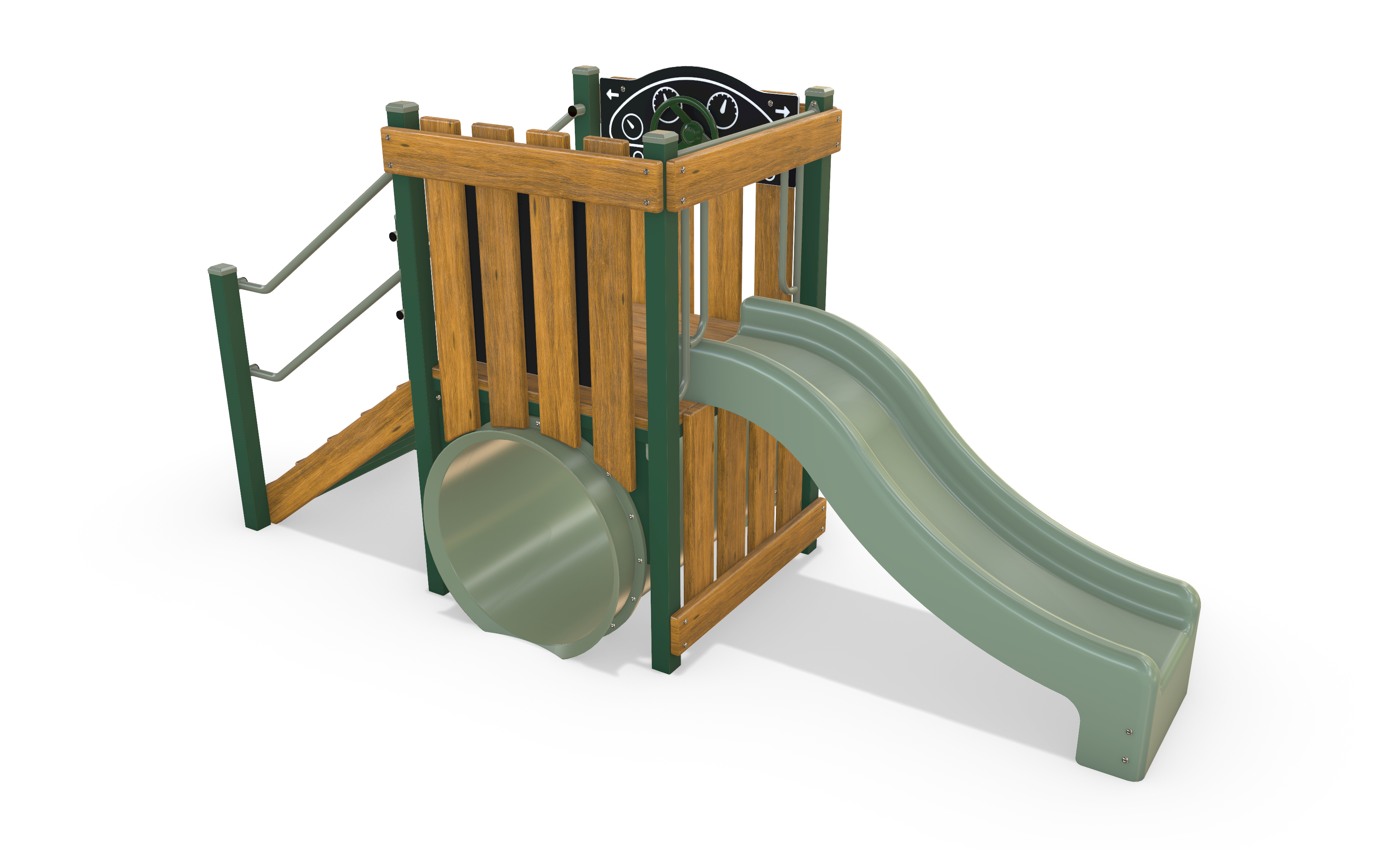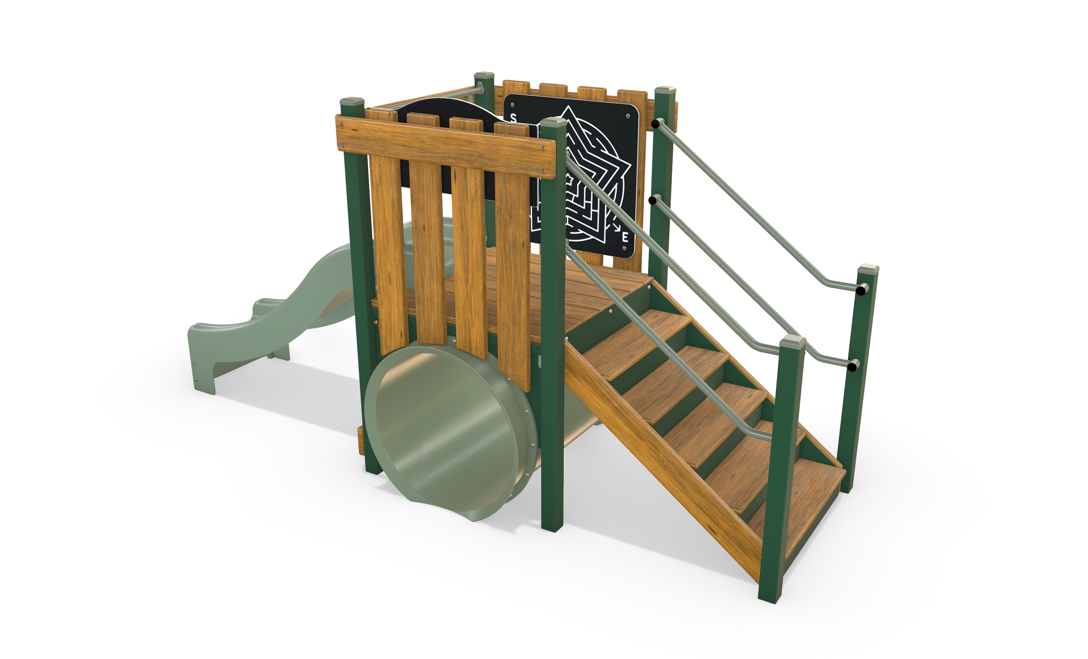 The Thornbill from the Fortitude Early Years range is purpose-built for early learning centres, combining warm Australian timber finishes with robust steel in ground components for lasting durability. It offers a balanced mix of developmental challenges—climbing, crawling, and problem-solving—while its design remains intuitive and safe for preschool-aged children. Featuring a crawl tunnel, slide, stairs, and activity panels, the Thornbill delivers endless engagement in a compact footprint.