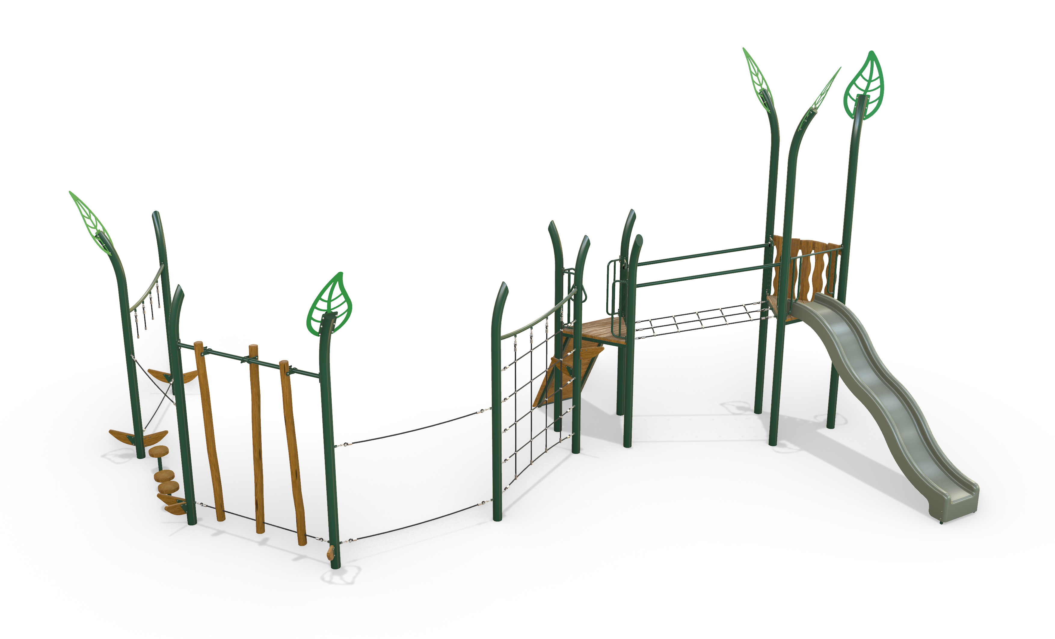 The Tea Tree Combination Unit brings together a compact combination structure and an integrated agility trail, creating a connected play experience that supports climbing, balance, and confident movement for a range of ages. Featuring sculptural leaf facades and natural timber detailing, it adds visual interest while maintaining the refined, landscape-led aesthetic of the Native range. Ideal for schools and community spaces seeking varied play within a cohesive design.