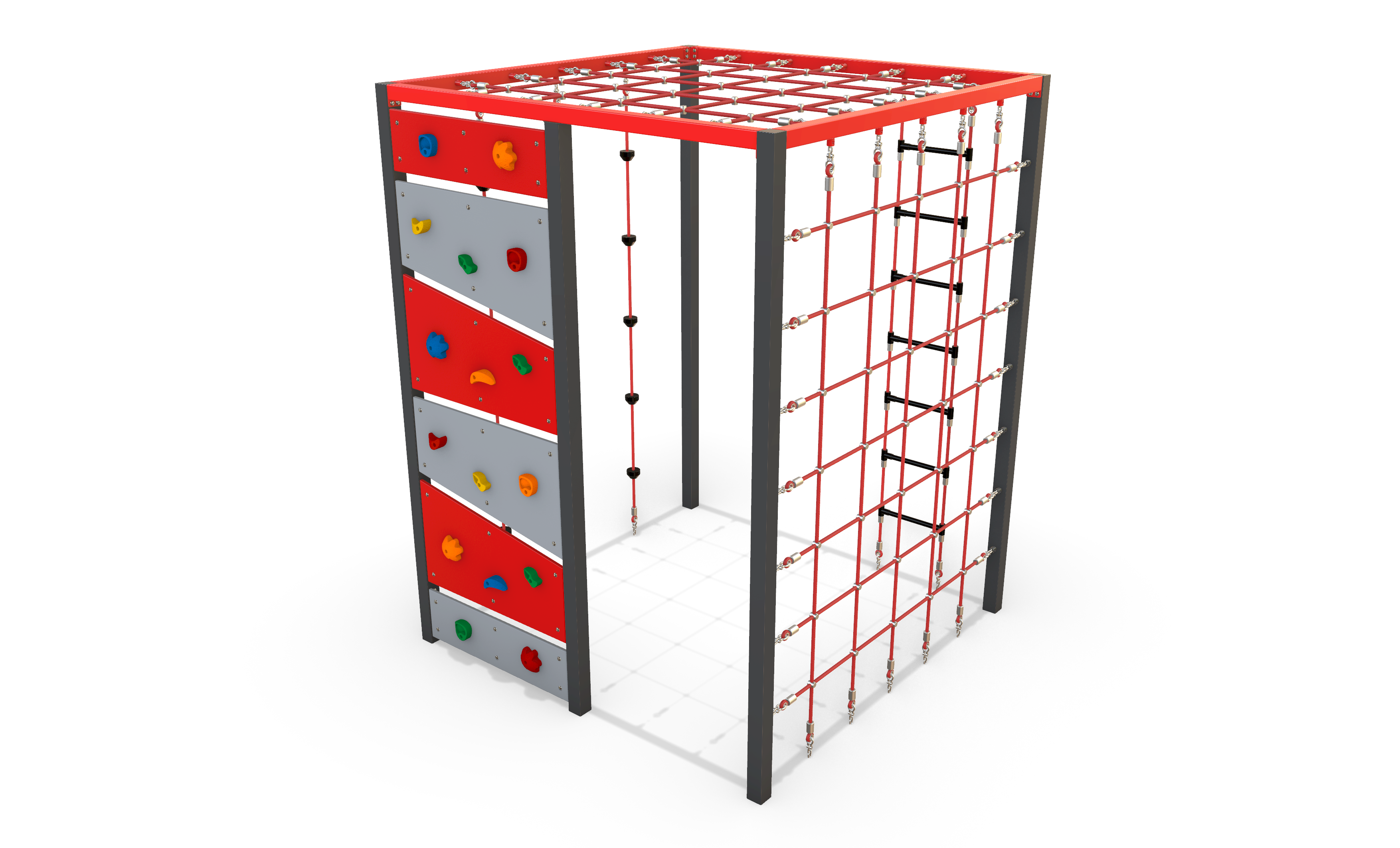 The Climbing Cube 2700 delivers an advanced and highly challenging play experience, designed for confident users seeking to push their strength, coordination, and agility. Featuring a range of rope elements including vertical and horizontal nets, a rope ladder, and climbing ropes, it encourages complex movement and problem-solving at height. HDPE climbing panels support strength and control, while the overhead net provides a demanding upper-level challenge. Constructed from durable steel and HDPE, this cube creates a bold visual presence and supports high-level, progressive play for older or more experienced users.