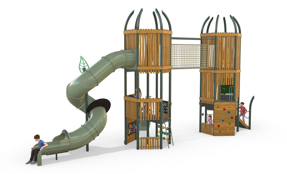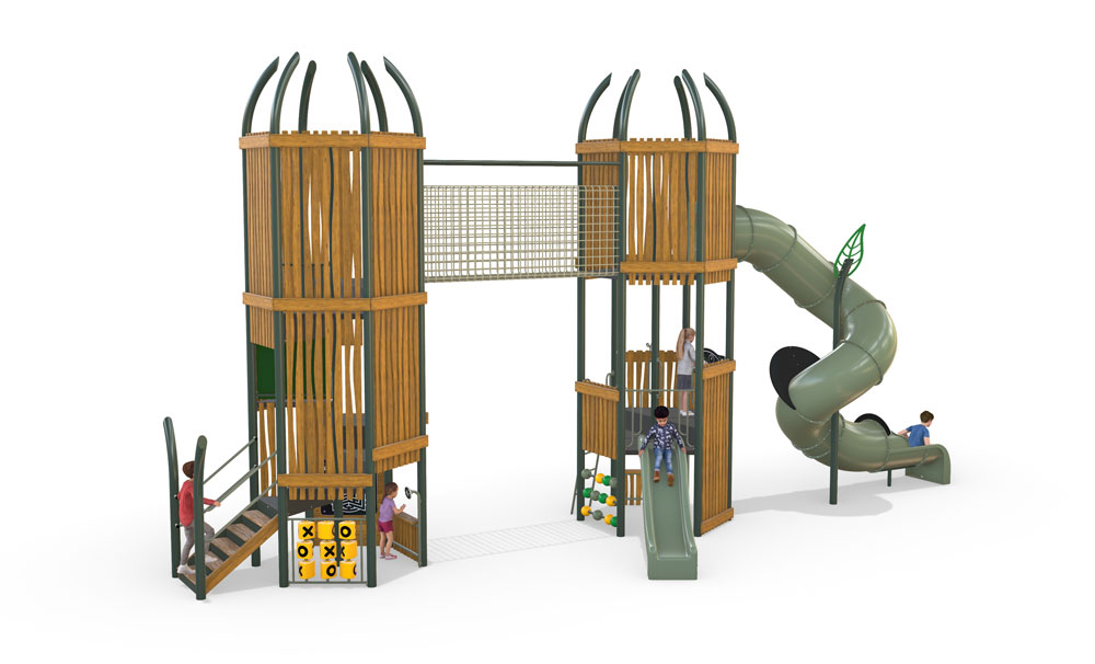 Standing proudly within our Native Range, Wurrunna Towers draws inspiration from the strength and storytelling of Australia’s First Nations heritage. Featuring twin interconnected towers, climbing nets, a spiral slide, and elevated play zones, this design encourages adventure, imagination, and connection. Built from Australian steel and native timber, it celebrates our landscape, craftsmanship, and the stories that shape us.